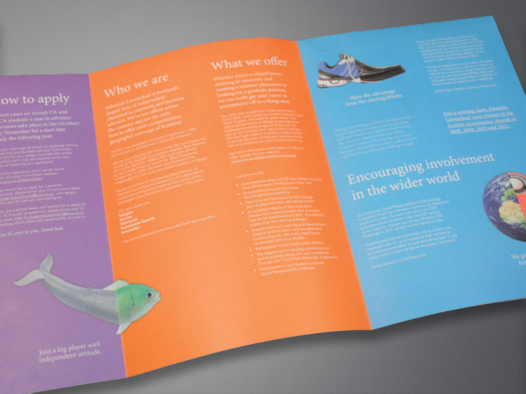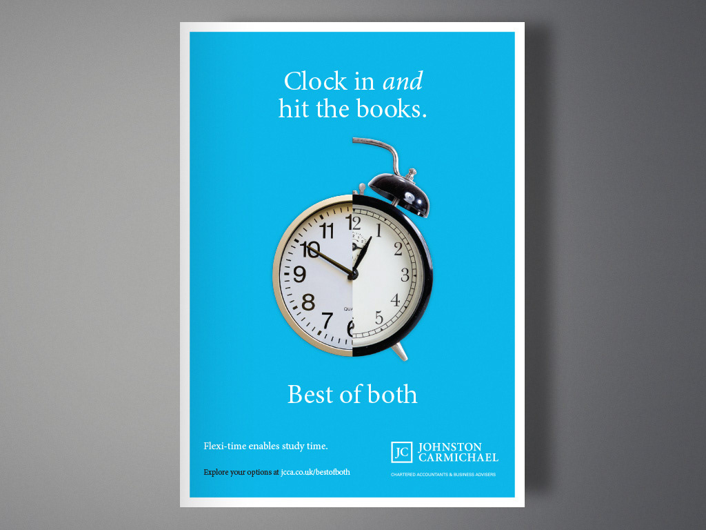 Johnston Carmichael is an independent firm of Chartered Accountants and Business Advisers based in Scotland. The aim of this project was to devise a student recruitment campaign that would increase applications to the student programme. I created the campaign line 'Best of Both' to represent the multiple benefits offered by the programme. Imagery which combined two photos divided in the middle was used to support the message. The campaign was applied to a microsite and printed fold-out piece.