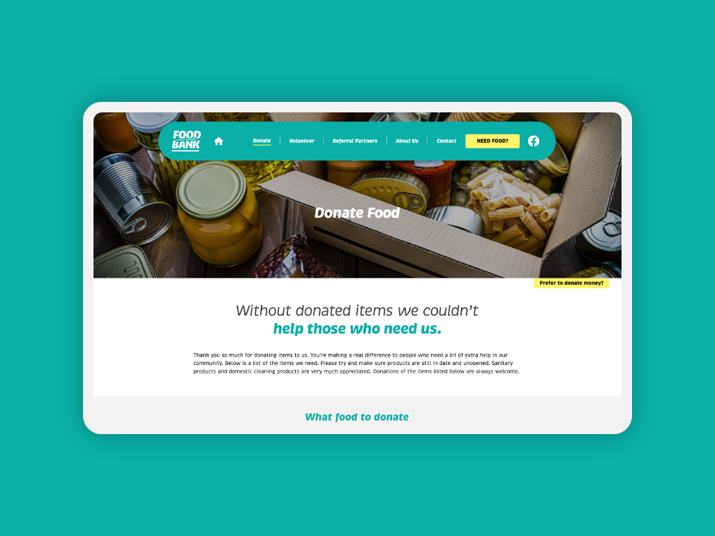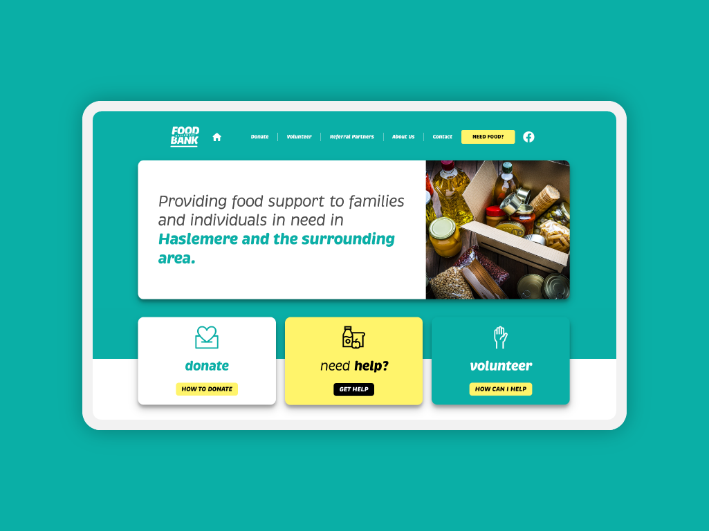 New website for Haslemere Food Bank using existing logo and brand guidelines. The task was to make it easy for users to make donations, get help and to volunteer.
