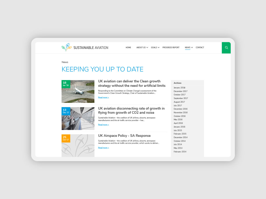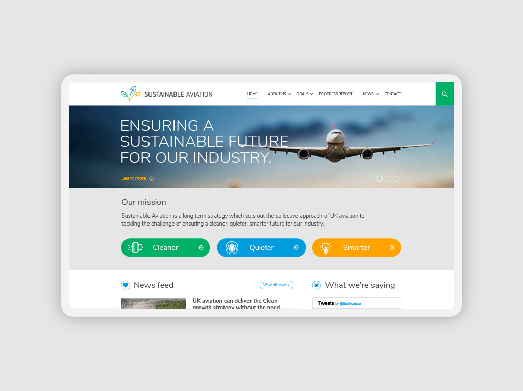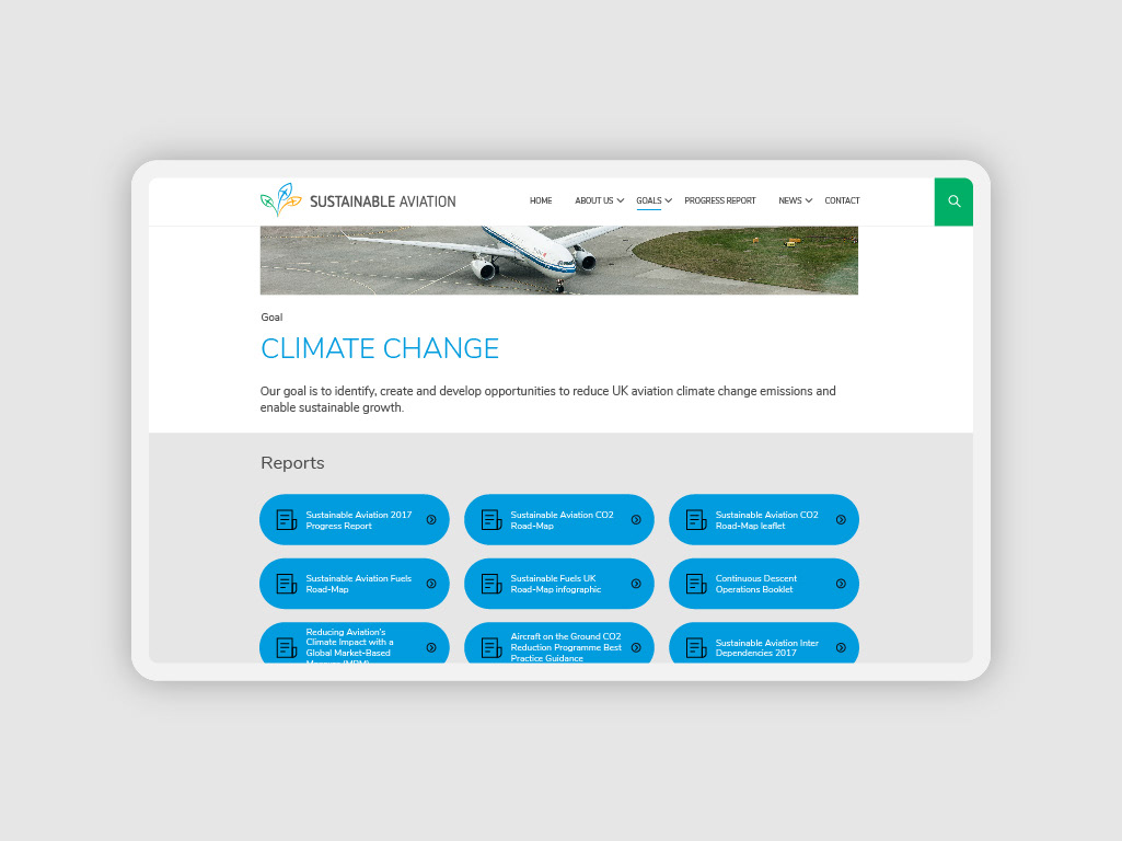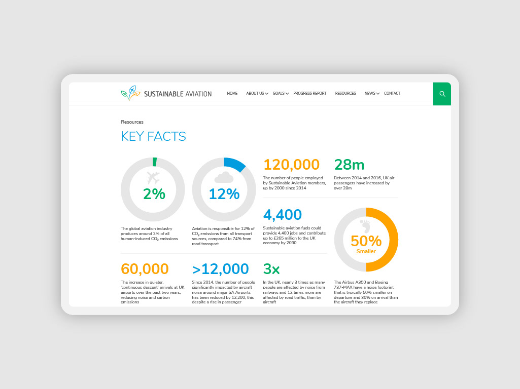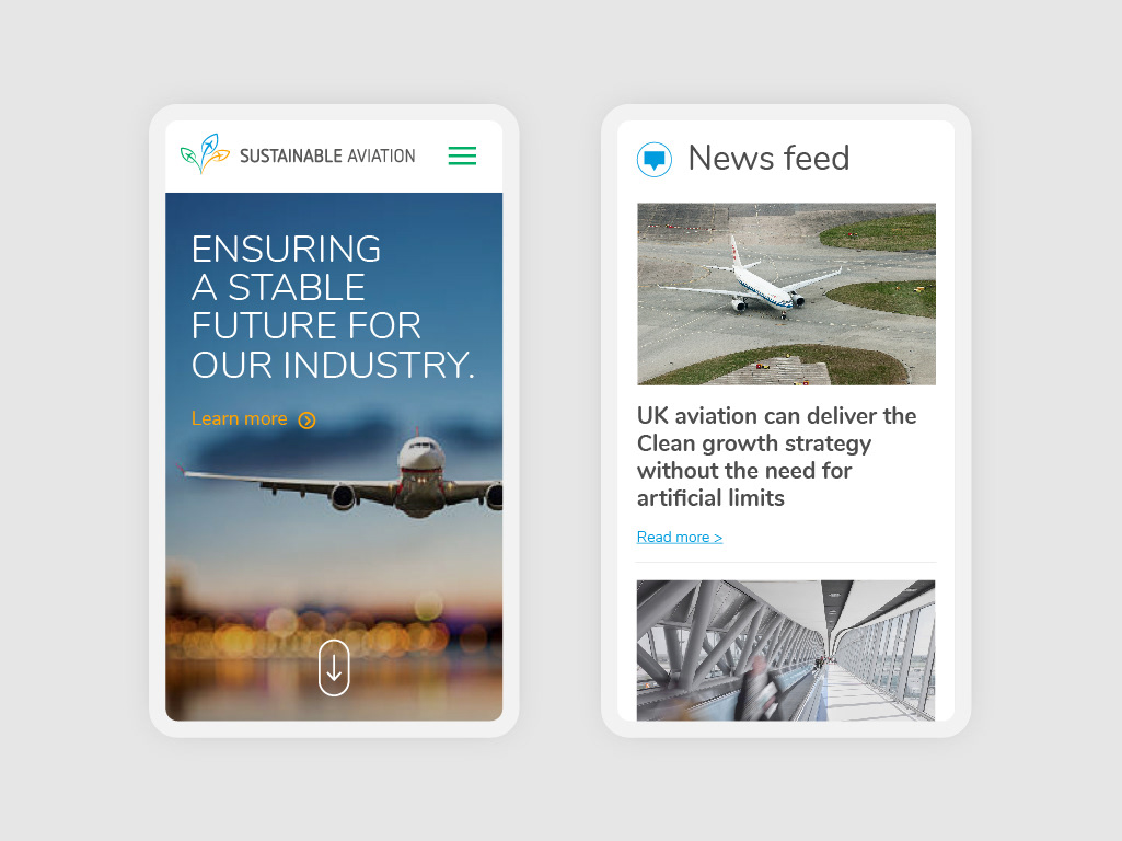 Sustainable Aviation is a strategy for the aviation industry to reduce the impact that it has on the environment. The task was to create a brand and website to support the ongoing strategy. A logo was created that combined both plane flight and nature in the form of airplanes within leaves. The brand language was designed to be light and bright, with rounded fonts and a bold limited palette.