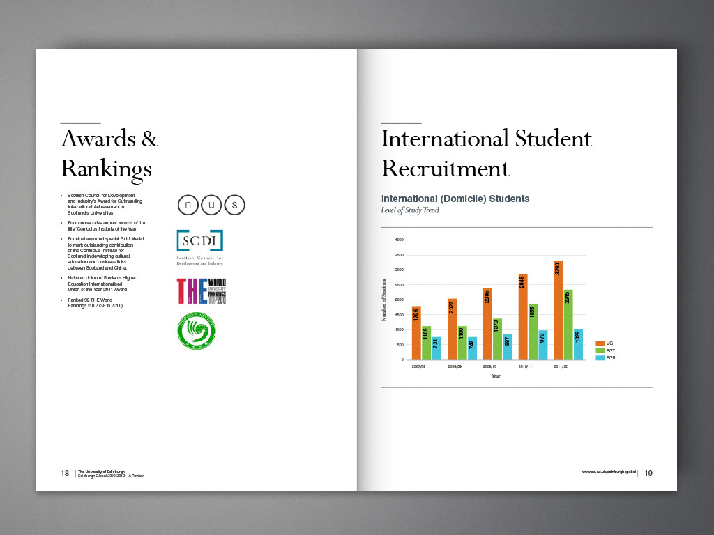 The University of Edinburgh Global Review is a document created to examine the strategy, targets and objectives of the University over a four year period. The brief was to display these findings in a professional, appropriate style that was in keeping with the current University look and feel. A striking graphic for the cover was developed which featured the iconic Edinburgh skyline situated inside a globe. Generous use of photography and splashes of colour helped to lift the design and bring stand out.